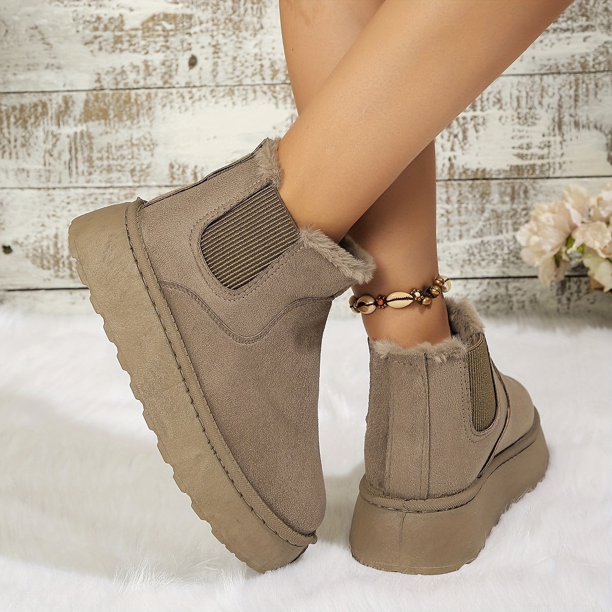 - Ciepła Futrzana Wyściółka: Miękka wewnętrzna wyściółka utrzymuje stopy w cieple, idealna na chłodniejsze dni.